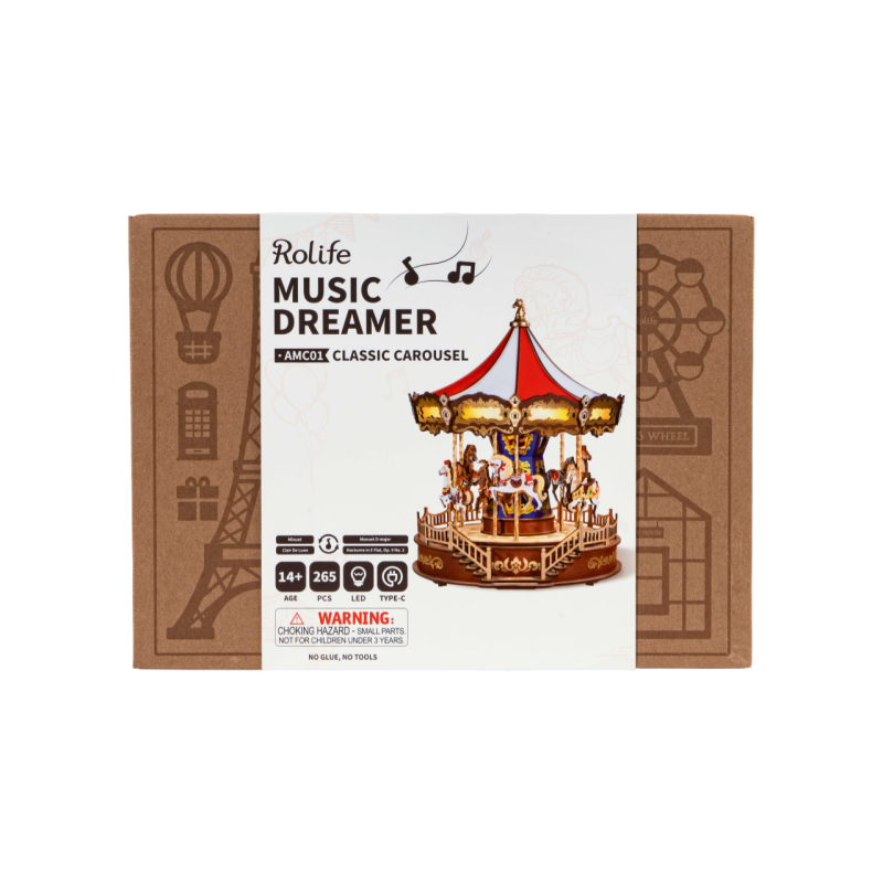 CLASSIC CAROUSEL giostra luminosa MUSIC DREAMER musicale ROLIFE carillon ROBOTIME in legno 3D WOODEN PUZZLE età 14+ Giostra luminosa e musicale CLASSIC CAROUSEL - MUSIC DREAMER in legno, della linea Rolife, di Robotime. Un puzzle in legno a forma di giostra non è solo per i bambini, piace a tutti. Il divertimento che proviamo ogni volta che vediamo un luogo felice con una giostra che gira, luci brillanti accese e persone che cavalcano è innegabilmente appagante: cosa di più se fossimo lì in quel momento? Rolife vi offre la sua versione di un puzzle in legno a forma di giostra con un po' di musica classica, per un'esperienza di gioco ancora più coinvolgente. La Giostra Classica Rolife è realizzata da artigiani professionisti, dalle luci fino ai dettagli più elaborati, per ottenere un design di prim'ordine con precisione, robustezza, durevolezza e raffinatezza. Ciò che la rende ancora più interessante sono le sue caratteristiche musicali che rasserenano il vostro umore e la vostra mente. Questo perfetto modello in legno 3D è perfetto come decorazione, regalo o giocattolo fatto a mano. Codice: AMC01. Pezzi: 265. Età: 14+